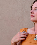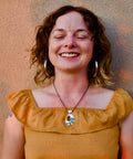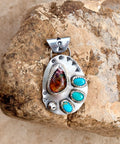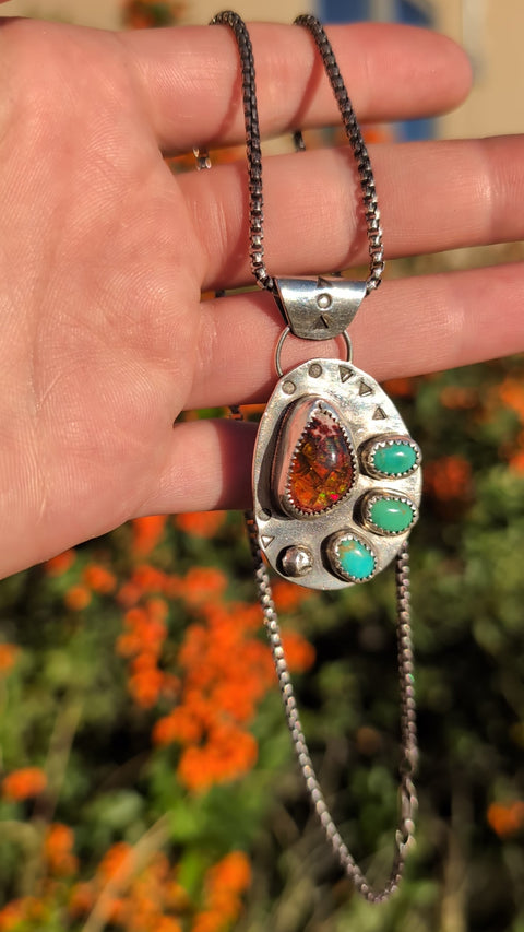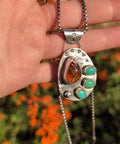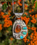 The Artist’s Palette Pendant — a colorful, witchy pendant featuring a dark-orange-red Mexican Fire Opal with flashes of orange, yellow, green, and hot pink. Three Tibetan turquoise stones accent the design, adding healing and protection. Fire opals are believed to bring courage, energy, and joy, making this a bold talisman of mystical self-expression.
