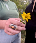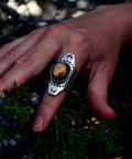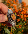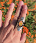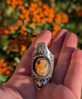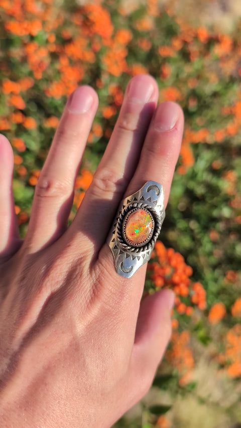 This striking Fire Opal Witch Ring #1 captures the fiery spirit of transformation. A brilliant orange Mexican Fire Opal dances with flashes of yellow and green, radiating warmth and vitality. Wear it as a symbol of courage, joy, and the magic of your own inner fire.