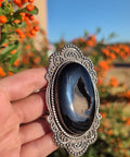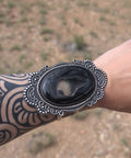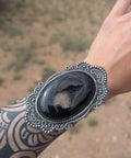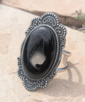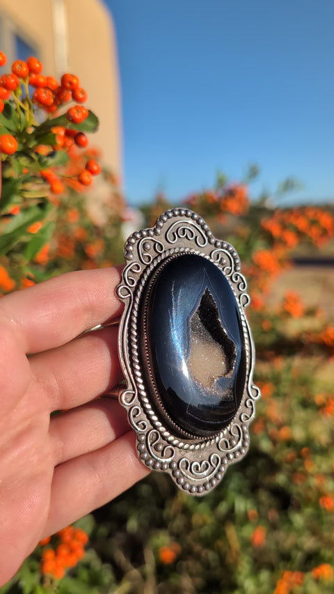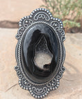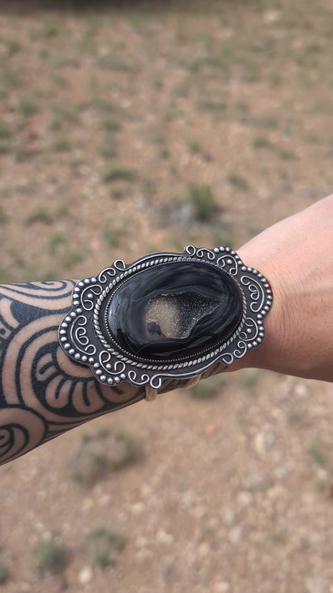This striking Gothic Onyx Druzy Cuff showcases a dramatic fusion of onyx and druzy — a powerful combination of grounding and energetic amplification. Onyx offers protection and courage, while druzy enhances balance and inner calm. A stunning talisman for bold, centered energy.