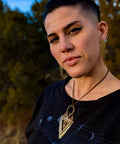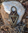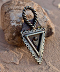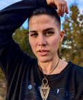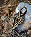 A symbol of duality and divine balance. The Hanging Fates pendant weaves chaos and order, the organic and the structured, into perfect harmony. At its center, the watchful eye and protective shield evoke the unseen forces that guide our path — the fates guarding each step of our journey through darkness and light.